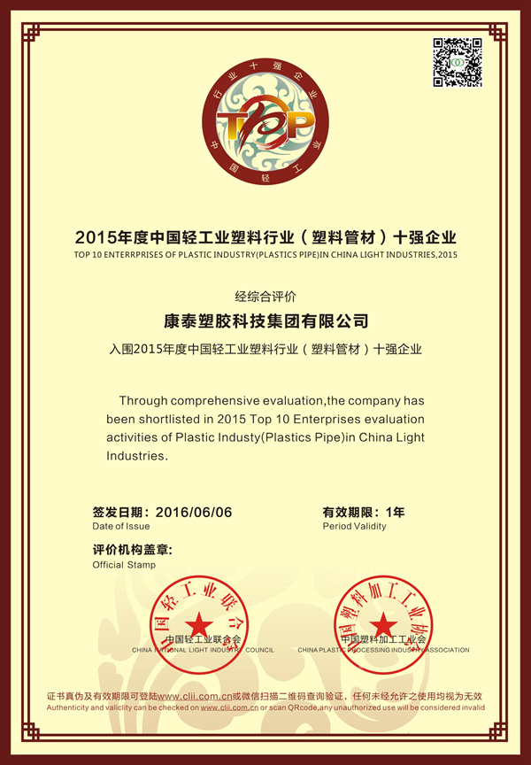 ? ? ? ?近日,中國輕工業(yè)聯(lián)合會在北京召開了“第五屆中國輕工企業(yè)家高峰論壇暨百強企業(yè)頒獎盛典”,向社會各界發(fā)布了“2015年度中國輕工業(yè)行業(yè)十強企業(yè)”榮譽榜單,康泰集團(tuán)憑借卓越的市場、盈利、質(zhì)量、研發(fā)等能力再度蟬聯(lián)中國塑料行業(yè)(塑料建材)十強。這已經(jīng)是康泰集團(tuán)2013、2014、2015連續(xù)三年榮登行業(yè)十強。