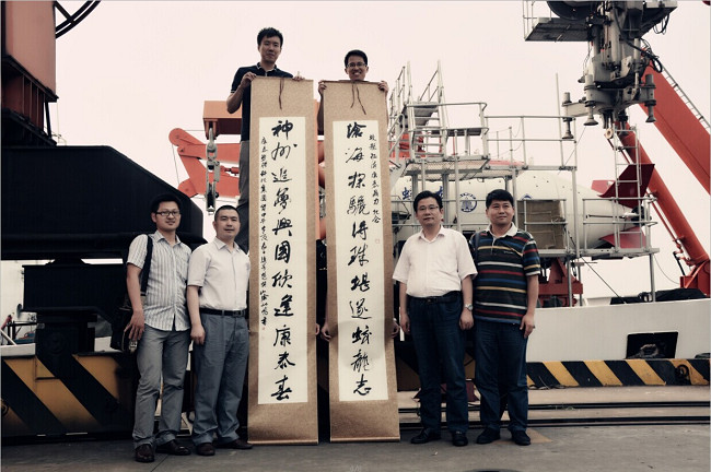 ??? 由于天氣的原因,臨時接到國家海洋局的通知將原定于6月25日在江陰港出航的蛟龍?zhí)栄悠谥?月4號在福州馬尾港出航,因此鄭總一行的主要目的在于與基地領(lǐng)導(dǎo)洽淡交流以及參觀合影,贈聯(lián)獻禮。雖無法看到蛟龍?zhí)柍孙L(fēng)破浪的英姿,但能夠零距離接觸蛟龍?zhí)柾瓿色I禮亦激情自豪。