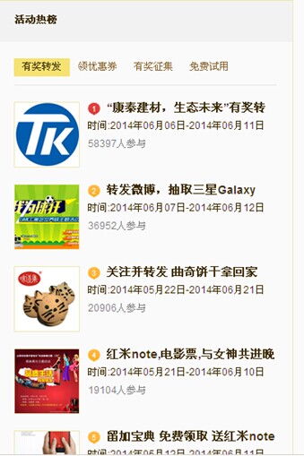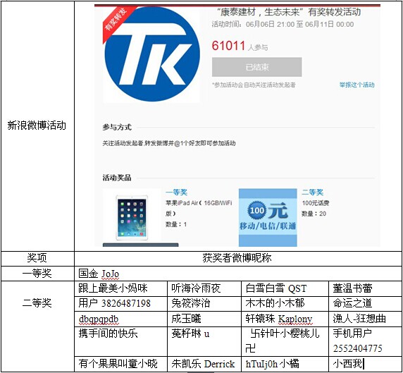 ??? 本次#康泰建材,生態(tài)未來#的新浪微博推廣活動自6月4日起至6月10日止,共計61011人次參與活動,并榮登新浪微博活動熱榜榜首!目前系統(tǒng)自動抽取一名一等獎獲得者,以及20名二等獎獲得者。新浪有獎轉(zhuǎn)發(fā)系統(tǒng)已經(jīng)通過私信的方式將獲獎信息通知到相關(guān)博主,我們將在三個工作日內(nèi)收集獲獎?wù)咝畔?,收集完畢?-5個工作日內(nèi)統(tǒng)一寄發(fā)獎品。以下是相關(guān)獲獎?wù)呙麊?,本次有獎轉(zhuǎn)發(fā)活動抽獎由新浪系統(tǒng)自動抽取,結(jié)果真實有效。